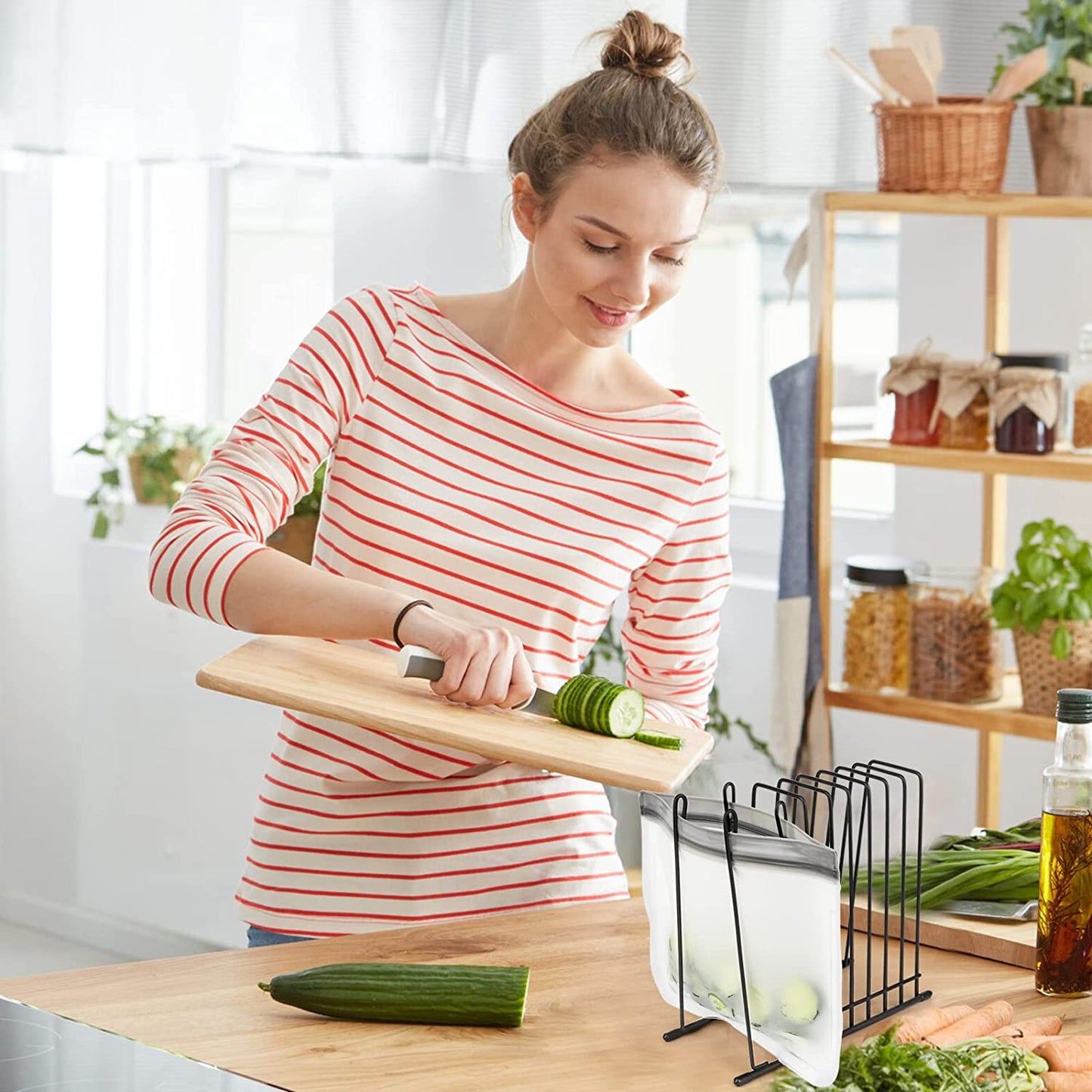 Hands Free Rack Clip: Simply fasten food bags under clips and fill, allows hands-free convenience for filling up baggies with food. It's like having an extra set of hands in the kitchen. Never worry about spilling any foods while putting it into your storage bags.